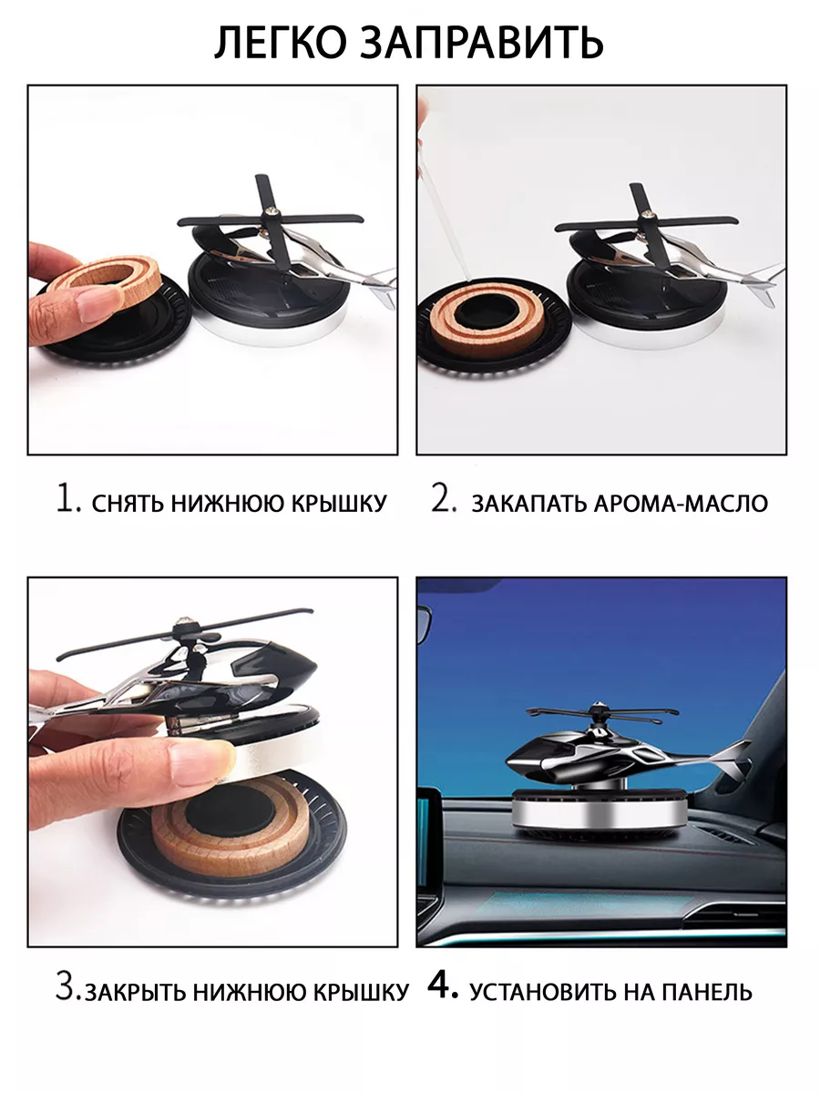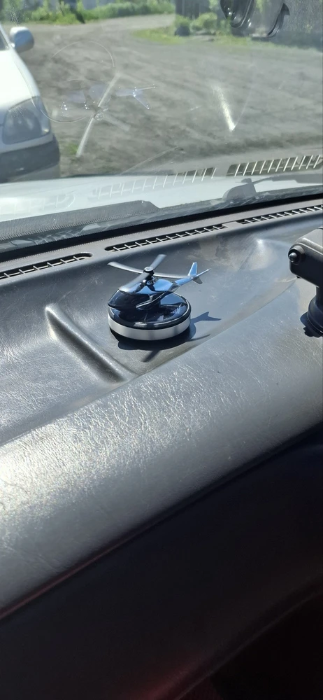 Освежитель на панель автомобиля придает невероятный аромат крутящийся пропеллер вертолетик, который работает на солнечной батарее. Аккумулятор-батарейка находится на площадке украшения под вертушкой. Вонючка вертушка в авто должна быть установлена на торпеду в зону доступности света. Внутри имеется впитывающая плашка, которую периодически необходимо пропитывать aroma - маслом.